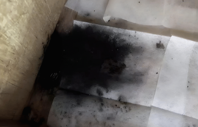 Ale w rogu nas czekało dziwny widok — ciemna, кашеобразная masa, jak sadzę lub rozsypany proszek. Wszystko było pokryte czarnym kurzem-tapicerka, rogi.